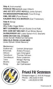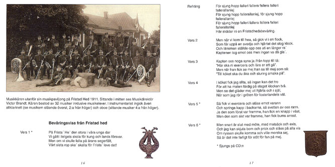 I CD-häftet finns alla verser nedtecknade. Tre verser används på inspelningen. På samma uppslag finns även en bild på musikkåren utanför musikpaviljongen på Fristads hed 1911. Musikdirektör var Victor Brandt.