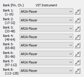 Varje bank spelas genom ett enda VST-instrument, såsom Garritan ARIA Player. Detta innebär att ditt dokumentet kan spela upp till 128 samtidiga Garritan instrument tilldelade till 128 olika MIDI-kanaler, fördelade över 8 ARIA Player instanser med varje instans värd upp till 16 Garritan instrument (1 per kanal). Om du klickar på pennikonen bredvid en bank öppnas VST-instrument som tilldelats denna bank, där du kan ställa det verkliga instrumentljudet för varje kanal.