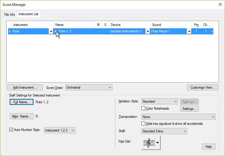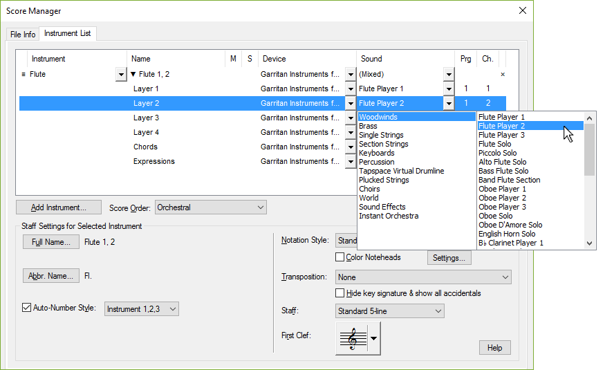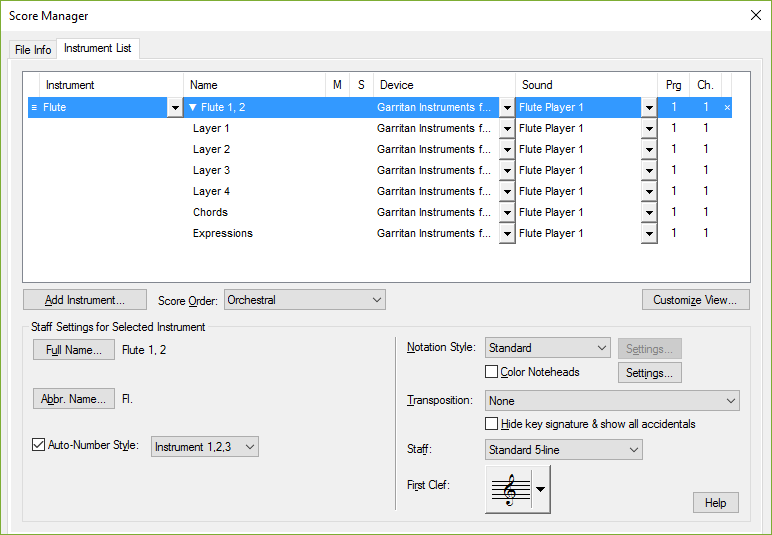Detta kan åstadkommas genom att i Hantera partitur tilldela olika lager av samma notplan till olika kanaler, sedan tilldela olika Garritan-instrument till dessa kanaler. Till exempel, låt oss titta i Hantera partitur för ett partitur med ett "Flöjt 1, 2"-notplan: