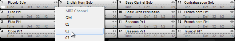 Ovanstående instrument som laddats i plats 1 är tilldelat MIDI-kanal 1. Du kan ändra MIDI-kanaltilldelning för denna kortplats genom att klicka på den nedre högra numret och välja en annan MIDI-kanal från popuppmenyn: