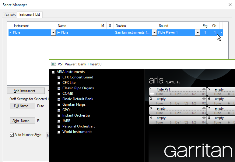 De kanaltilldelningar för varje instans av ARIA Player måste motsvara kanaltilldelningarna i Hantera partitur. Till exempel, om du har en flöjt tilldelad kanal 1 i bank 1 ARIA Player, då måste flöjtnotplanet i Finales Hantera partitur tilldelas Bank 1, Kanal 1:
