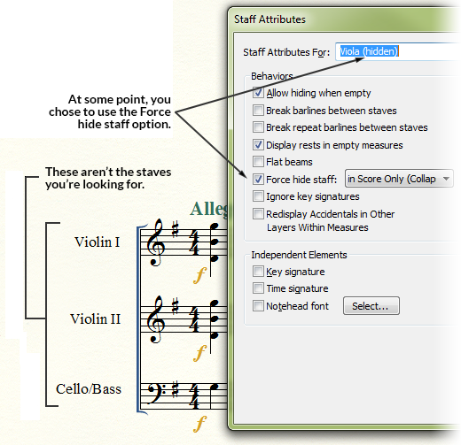If you would like to hide staves that include music, use the Force Hide Staves check box in the Staff Attributes dialog box. A staff can be removed from a system entirely (collapse), or, using a Staff Style, measures can be hidden leaving blank space instead of staff lines (cutaway) (see To hide measures).