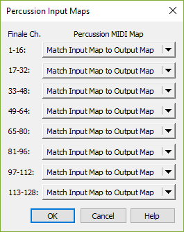 • Percussion Input Map. From this rullgardinsmeny, choose the device and the specific patch you are using for entry to properly configure percussion MIDI input. Match Input Map to Output Map is selected by default. With this option selected, Finale automatically uses the Percussion MIDI Map chosen for playback for the staff as assigned in the Score Manager.