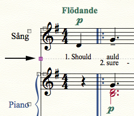 Lägg märke till att den andra versen nedanför sångnotplanet är ganska nära pianostämmans översta notplan. Låt oss flytta ner det notplanet i de två första systemen.